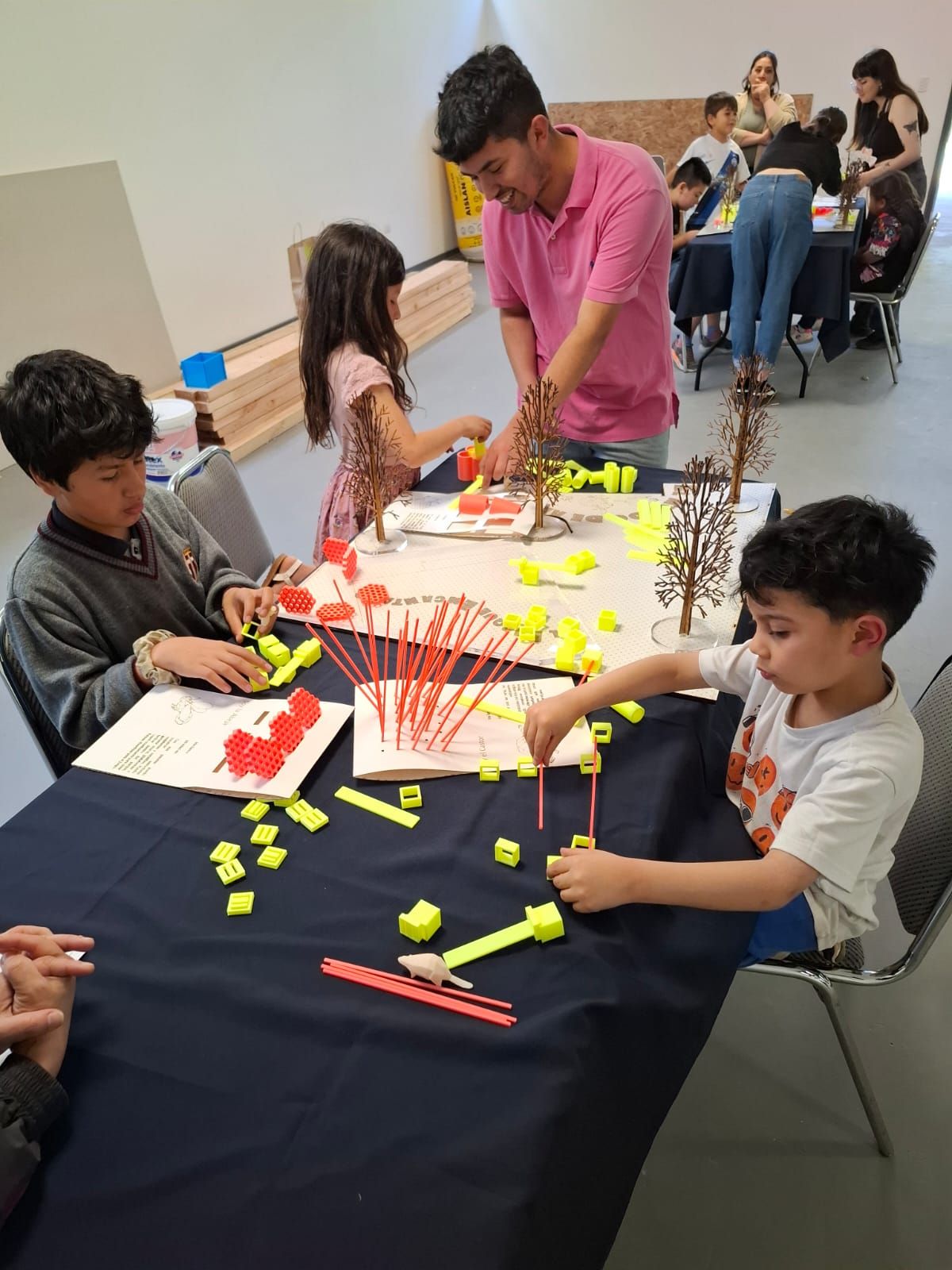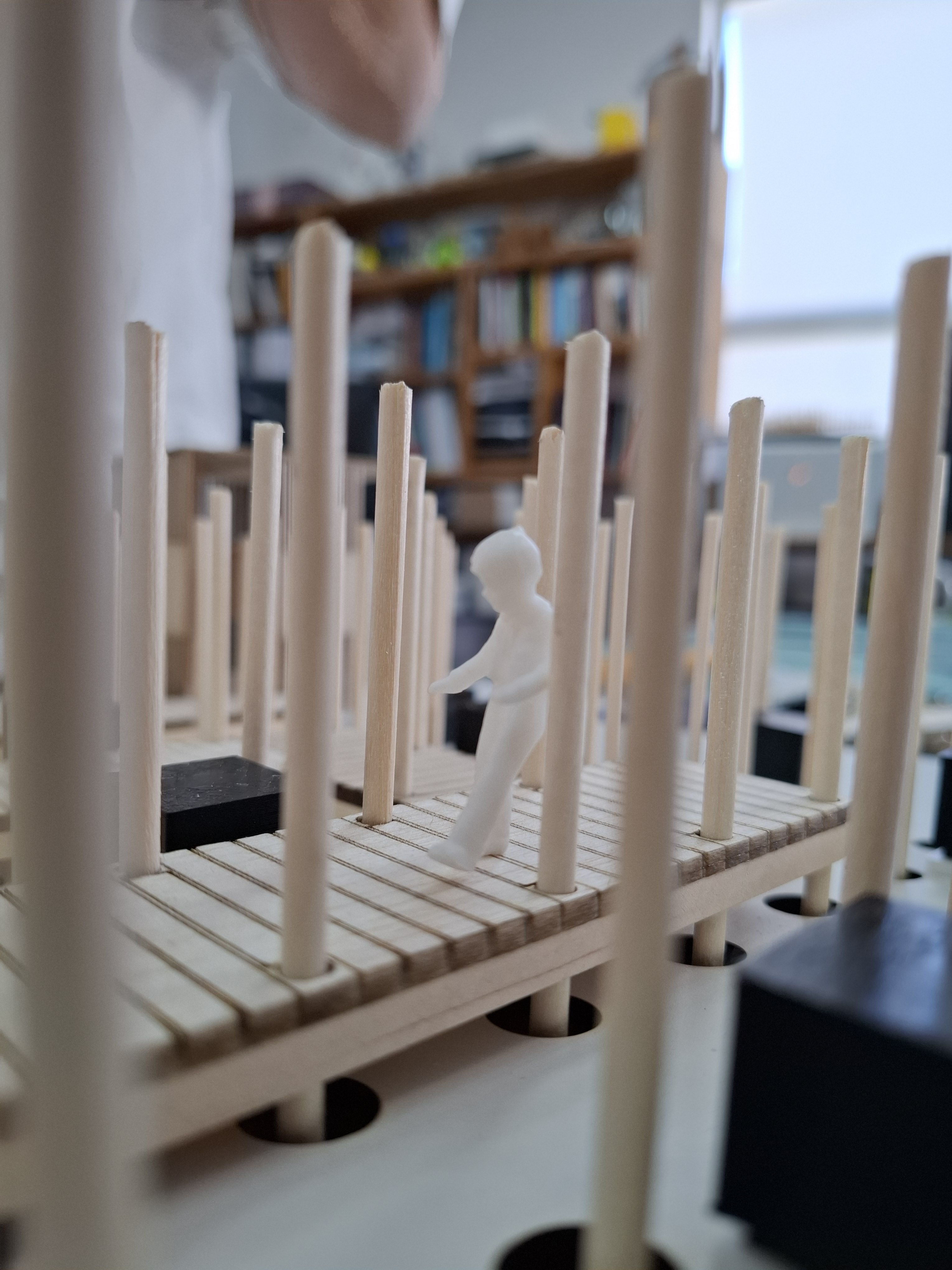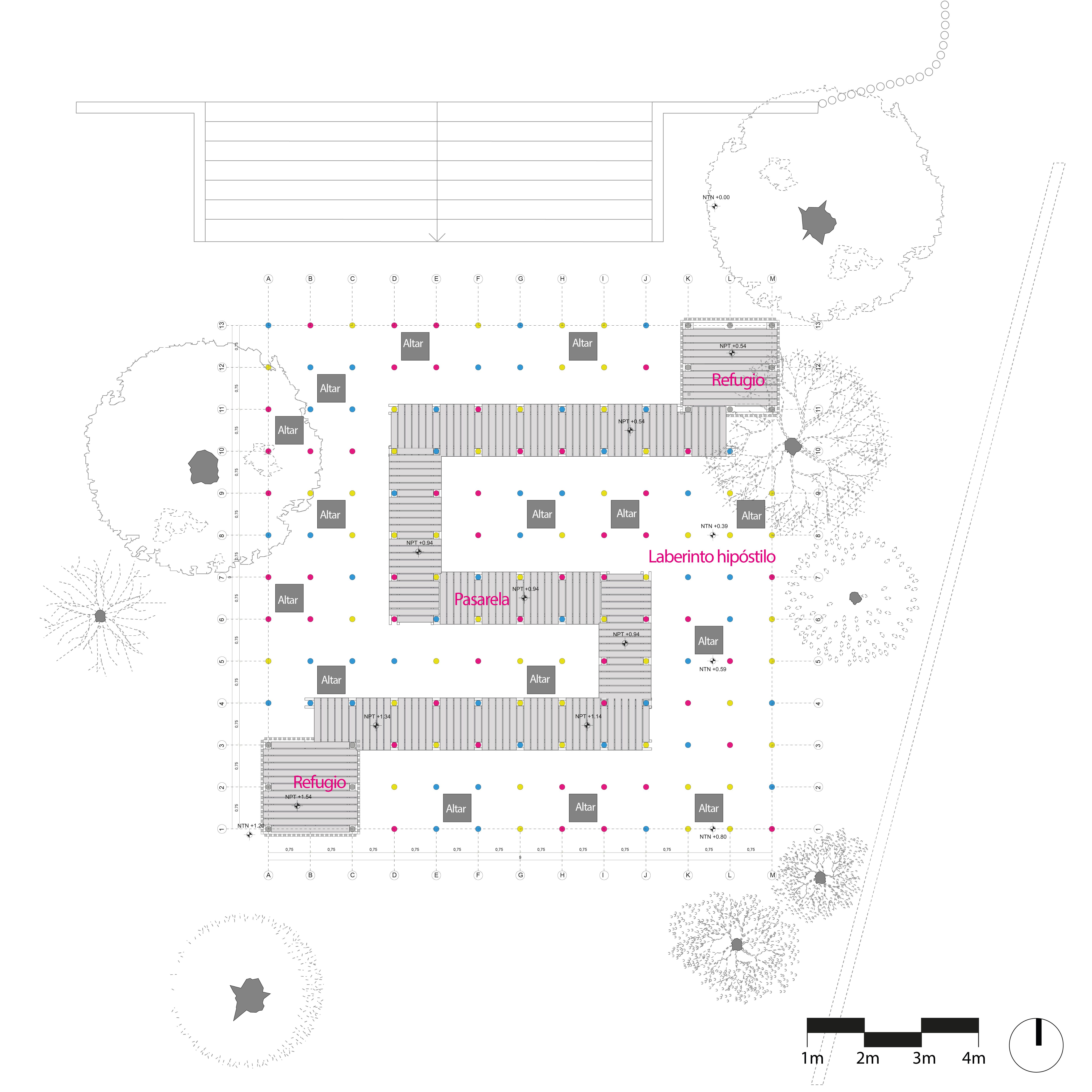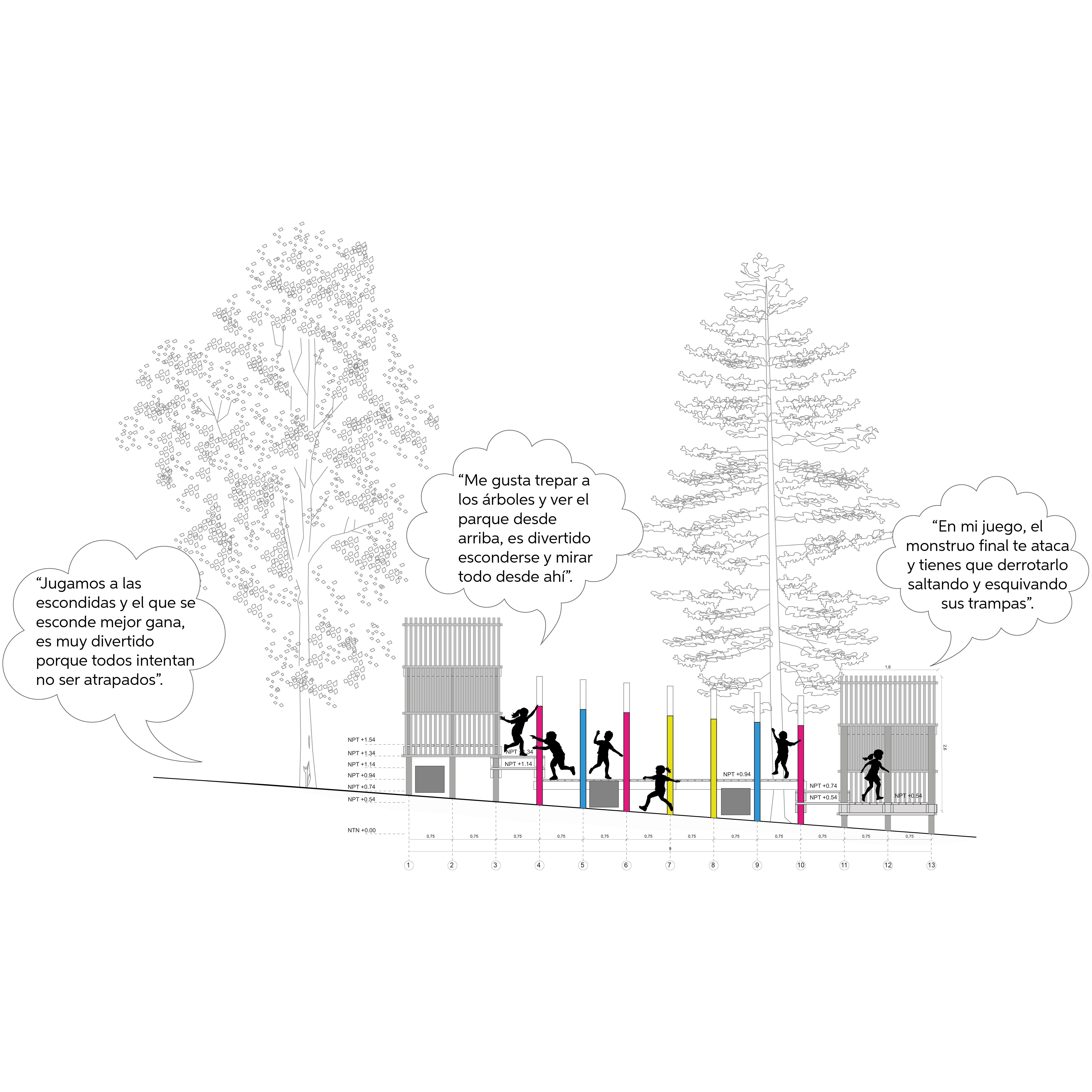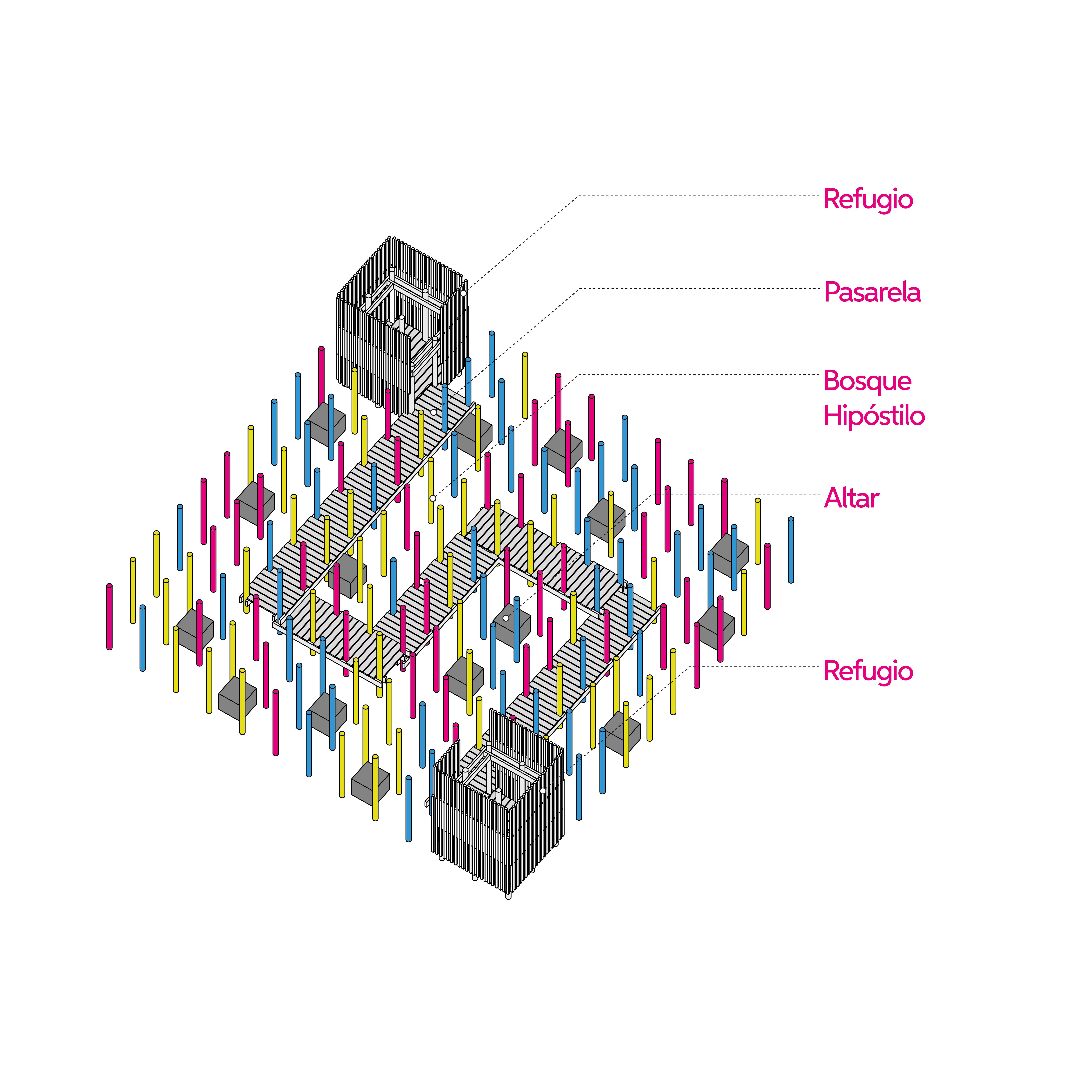 “El Laberinto Embrujado” se materializa como una estructura de 81 m², construida en madera y hormigón, pensada para incentivar la exploración libre y la apropiación creativa del espacio por parte de las niñeces. Su configuración espacial se inspira en un bosque hipóstilo, donde en los intersticios de esta estructura se disponen quince altares conectados por una pasarela escalonada que enlaza dos refugios principales. Estos elementos estimulan la imaginación narrativa, la colaboración y la experimentación, al ofrecer un entorno que no impone una única forma de jugar, sino que posibilita múltiples interpretaciones y usos.